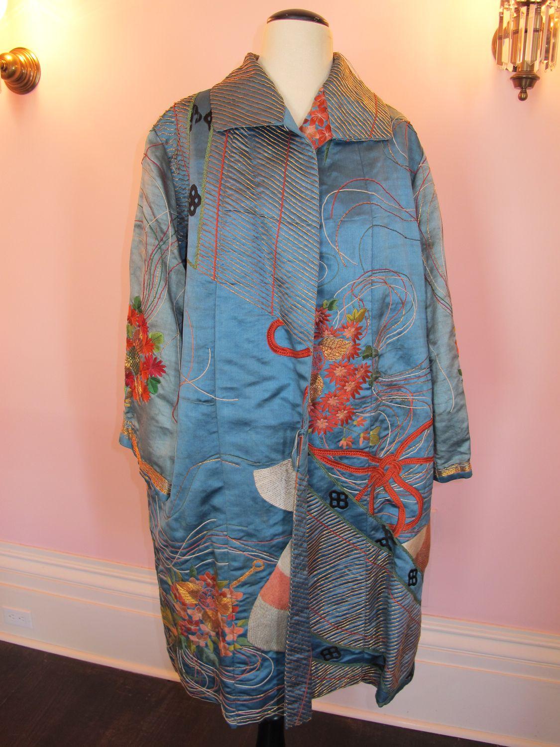DescriptionTurqouise coat with multicoloured embroidery; Asian motifs of crane and flowers; black braid applique; wide collar, loose fitting