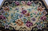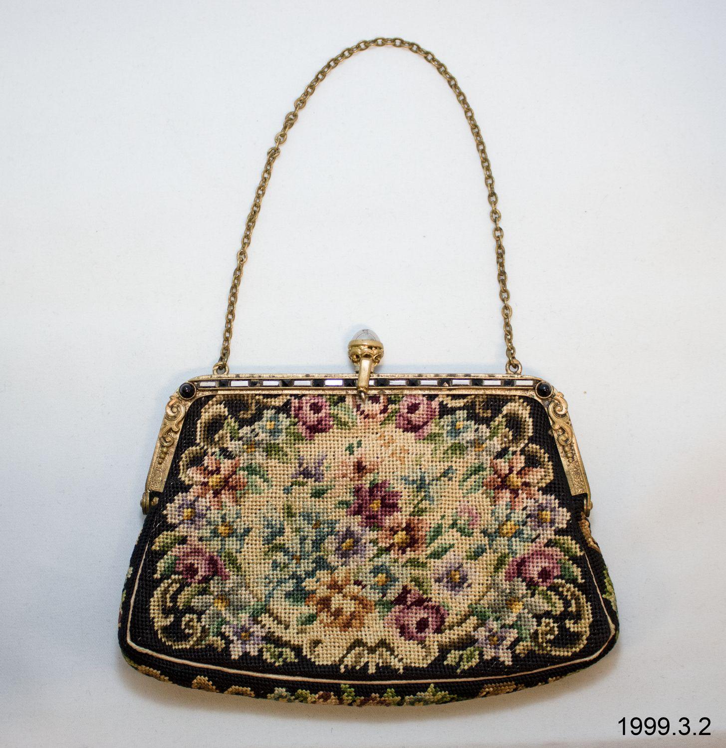 Purse, petit point floral design, multicoloured on black background with gold clasp with decorative metal silver and black cut inlay and chain handle.