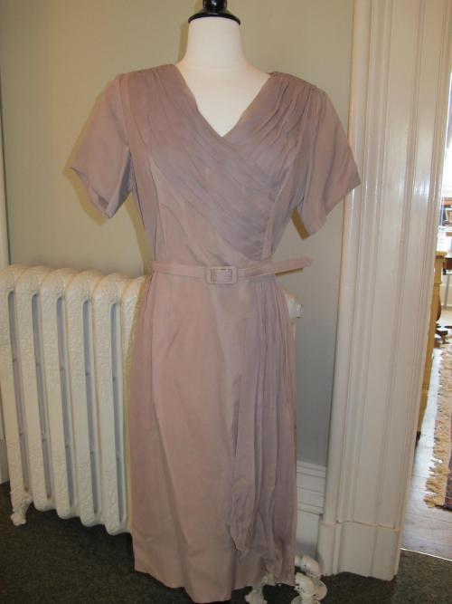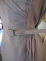 Taupe chiffon short sleeved, v-neck day dress with belt.
