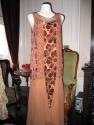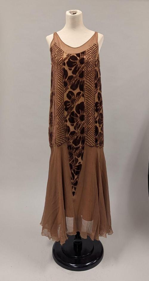DescriptionSalmon coloured silk chiffon dress with rust coloured cut velvet floral design dress and jacket; round neckline; sleeveless; drop waist; handkerchief hemline.