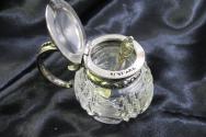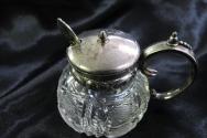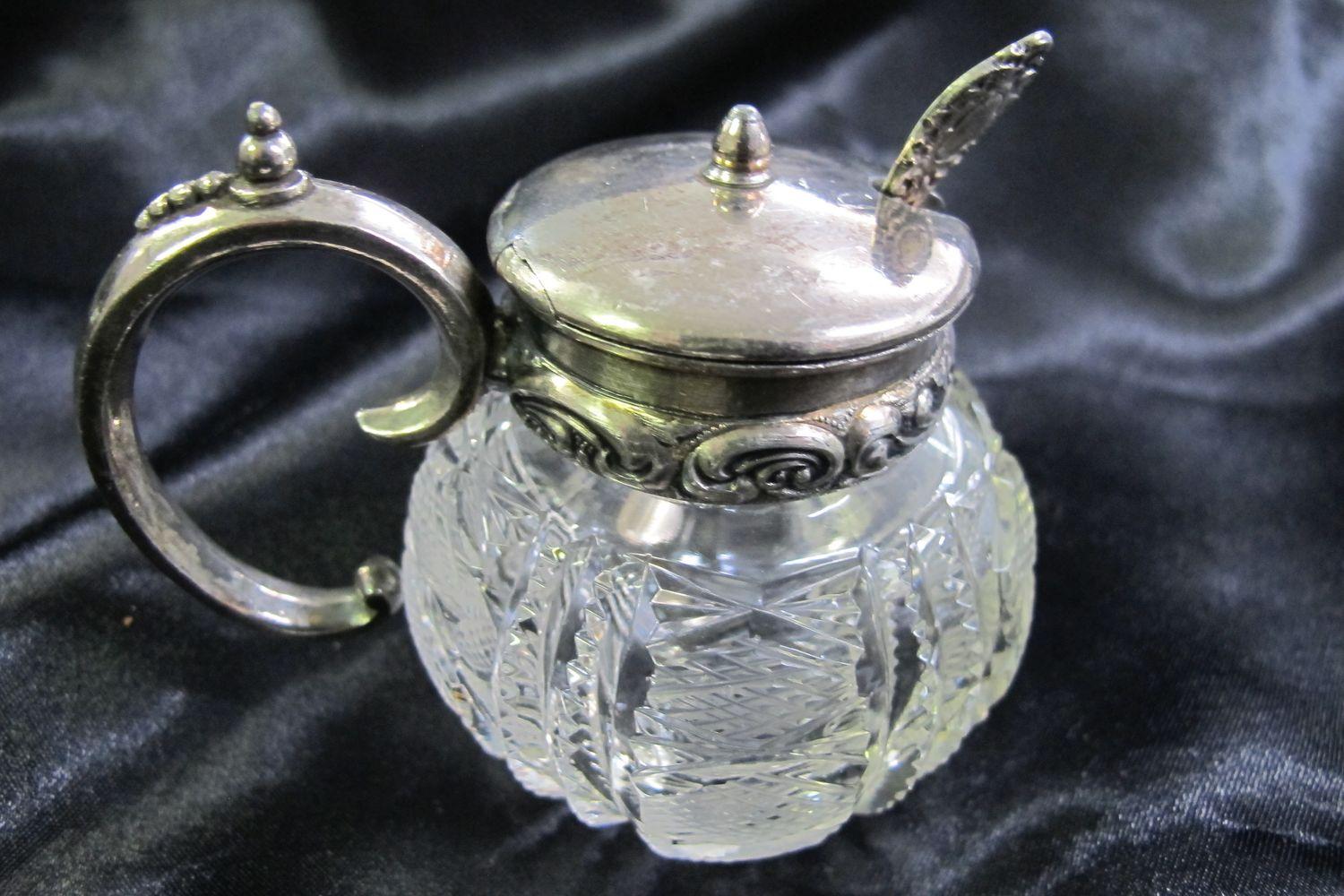 DescriptionCrystal mustard pot with silver lid/handle and silver spoon.