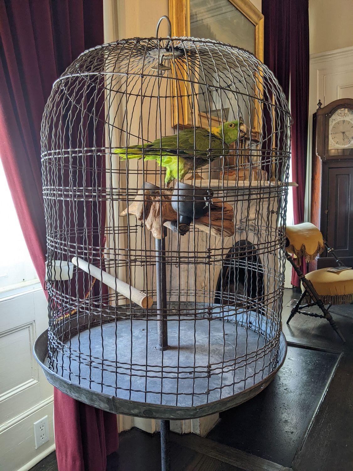 DescriptionTaxidermied parrot "Barnacle Bill". Yellow-Naped Amazon Parrot in large metal domed birdcage.