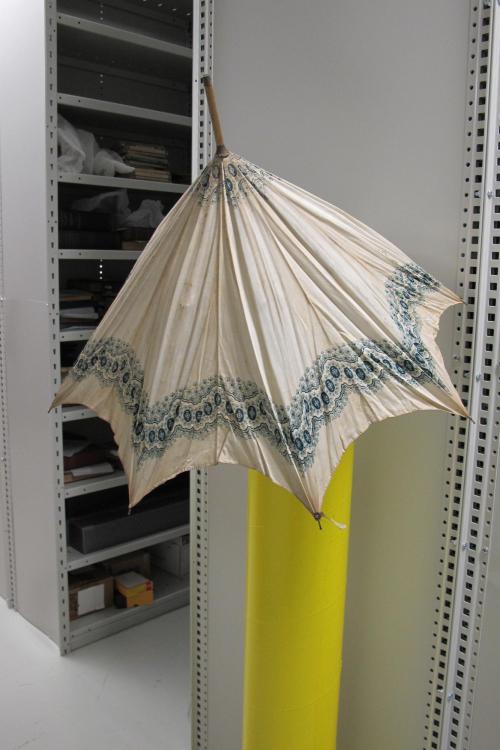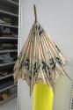 White cotton with dark blue and green floral print canopy and bamboo handle.