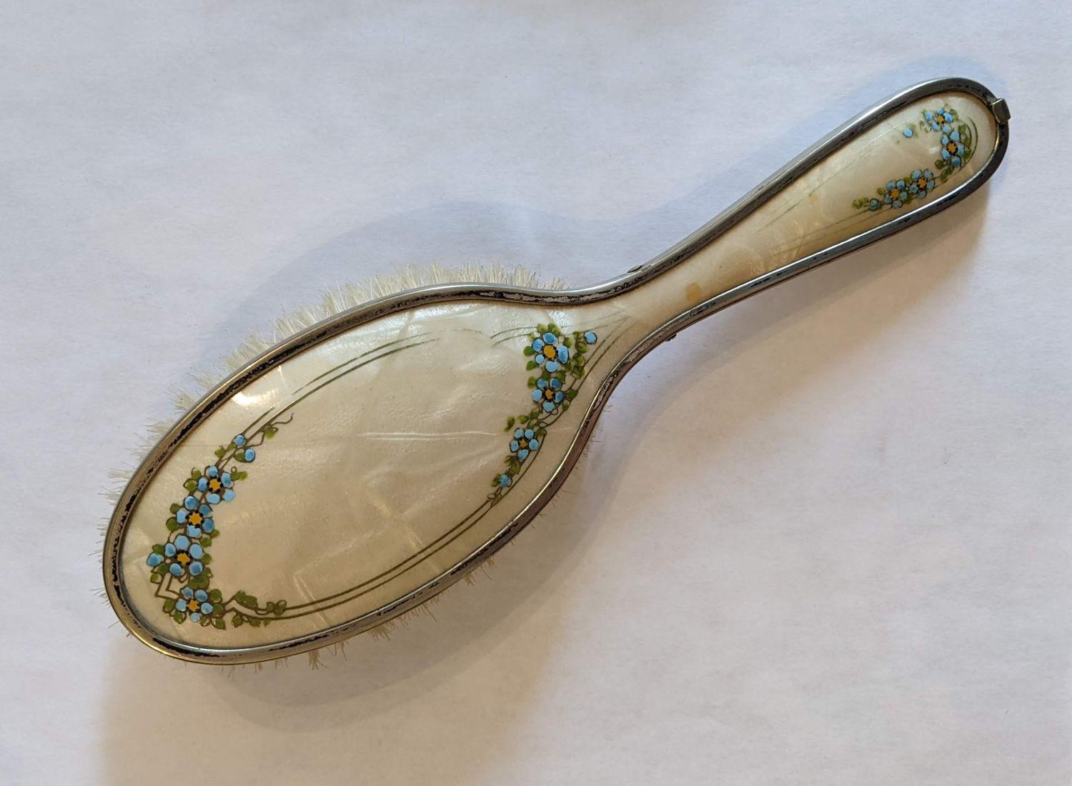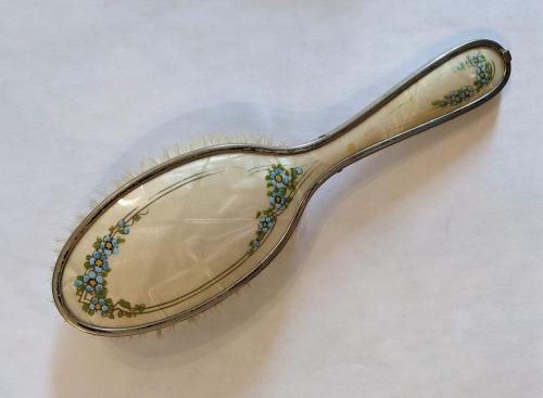 DescriptionIvory-yellow coloured plastic dresser set known as "pearl on amber" or Bakelite.