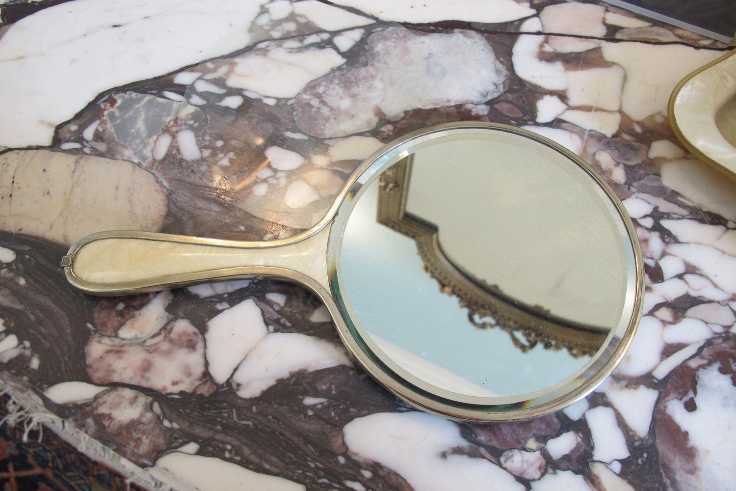 Ivory-yellow plastic with silver edging and blue floral decoration hand mirror.