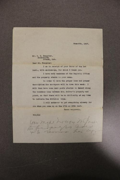 DescriptionTyped letter from William Davis to G. E. Fauquier; about the surveyance and dividing of respective properties of St. Jude’s Church and Mrs. McIver; handwritten note on the bottom of the paper; dated June 6, 1927.