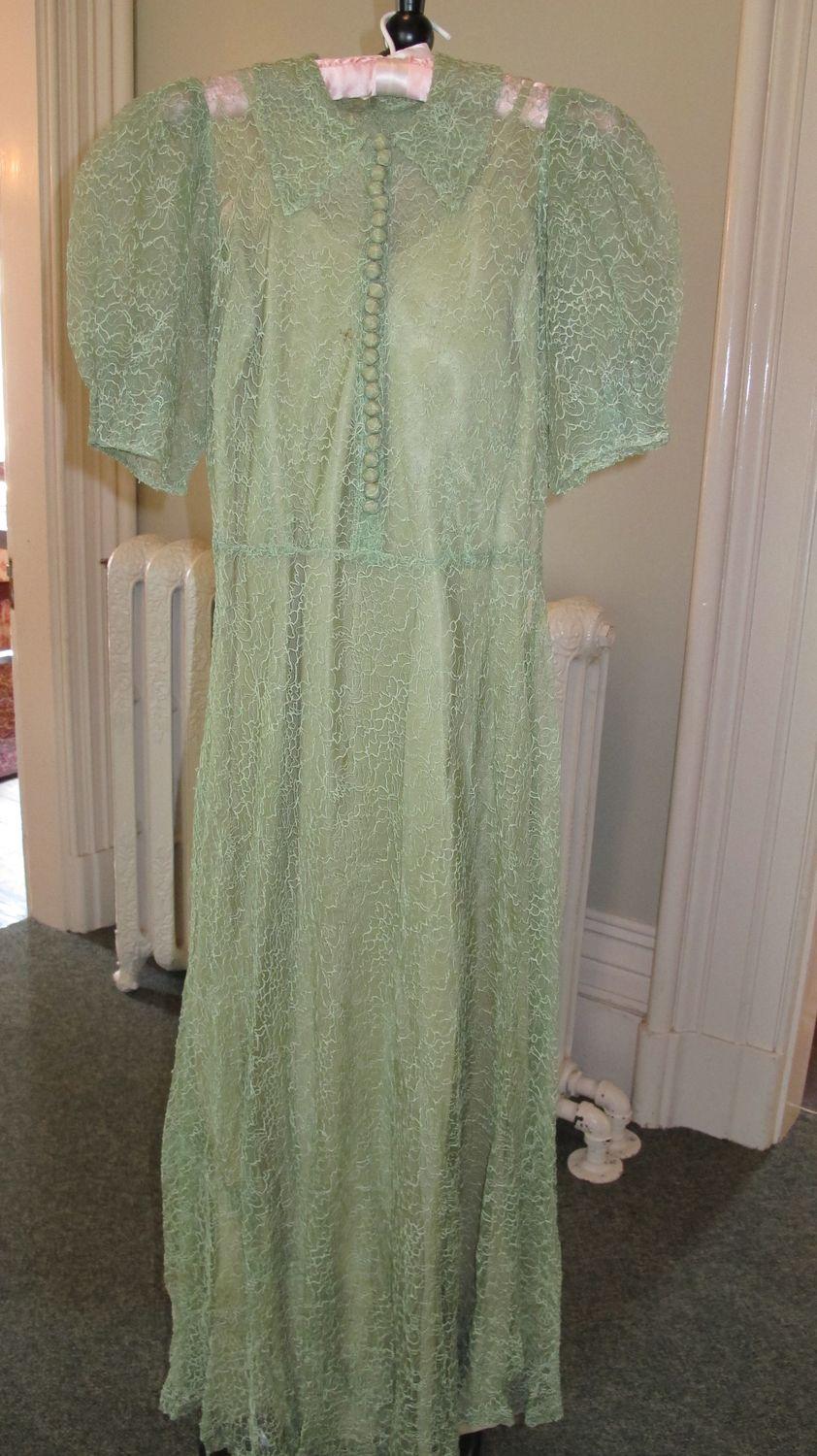 DescriptionApple green lace over green satin slip, short sleeves, covered button placket front.