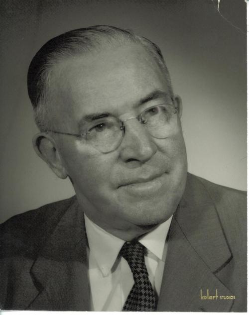 DescriptionPhotograph of head and shoulders of older man wearing glasses; head turned towards proper right; man is wearing a blazer, white button up shirt and a check patterned tie