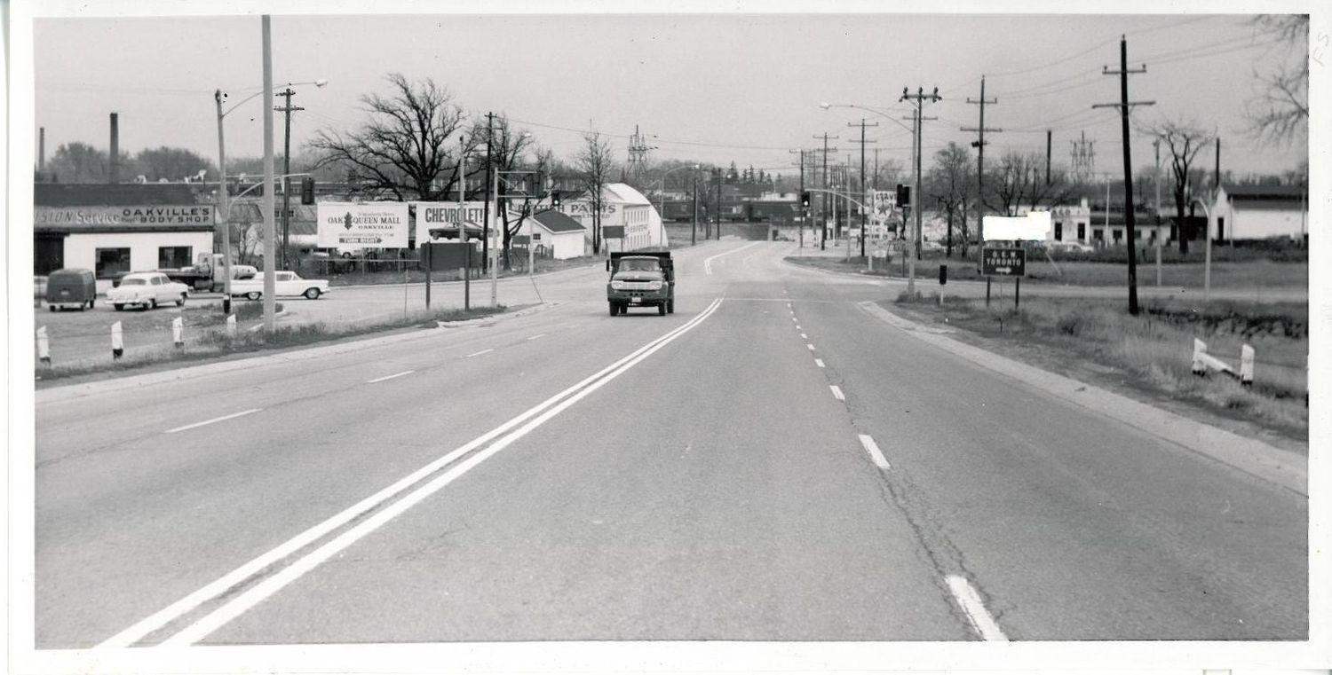 DescriptionPhotograph of a street scene; four lane road way with a truck in the left lane driving towards the camera; behind the truck is an intersection; on the proper left side of the street are telephone poles; before the intersection there is a sign reading 'Q.E.W. TORONTO' with an arrow below; pass the intersection there are various buildings; on the proper right side of the intersection there is a lot with cars; waiting at the lights on the proper right side is a white car; in the distant background there are electrical towers
