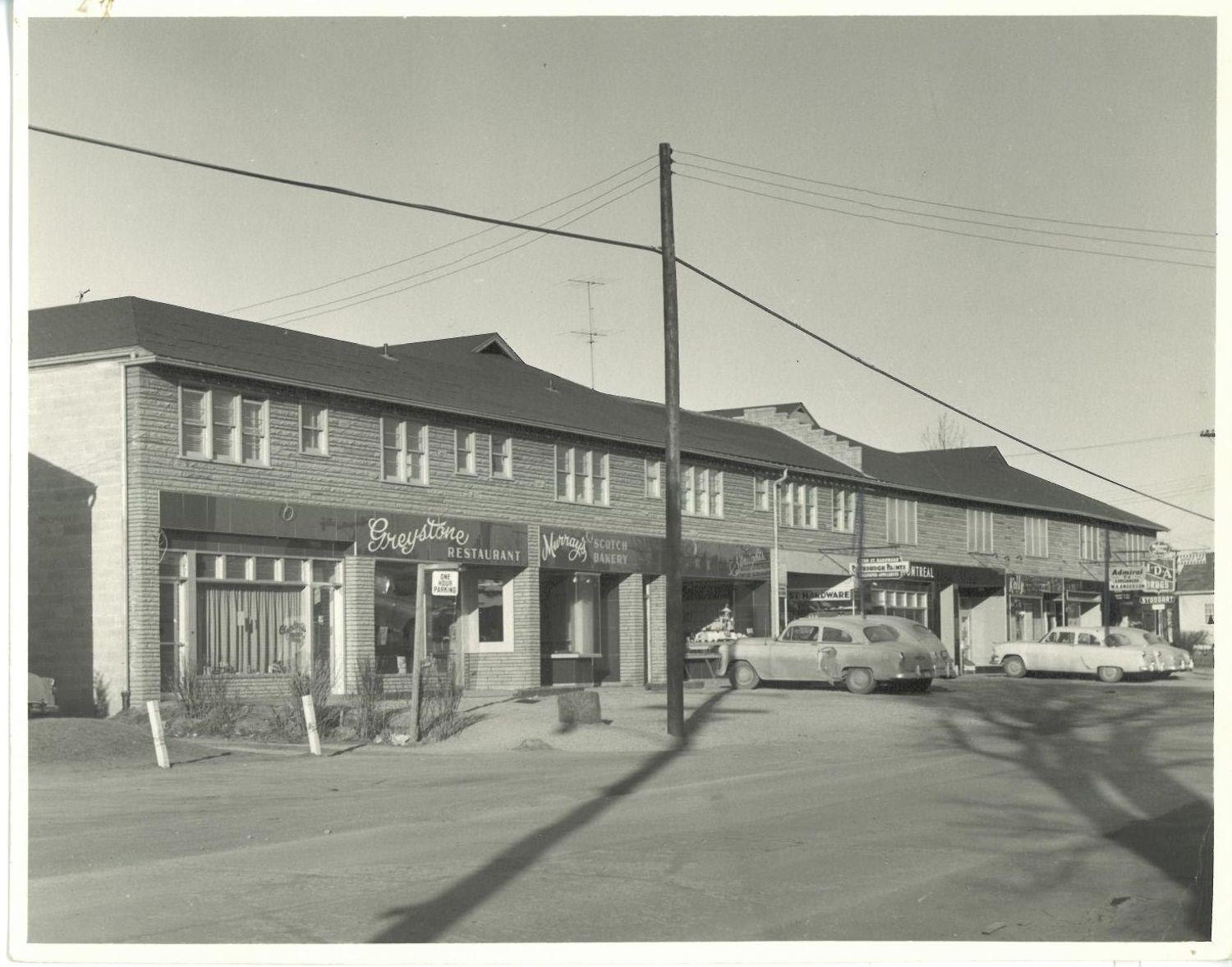 DescriptionPhotograph of a block of six businesses; view from street; two sets of cars are parking in front; two in front of second business from proper right and two in between fourth and fifth; hydro pole and part sign are next to road in front of the building; businesses include: Greystone Restaurant, Murray's Scotch Bakery, hardware store and an I.D.A. drugstore