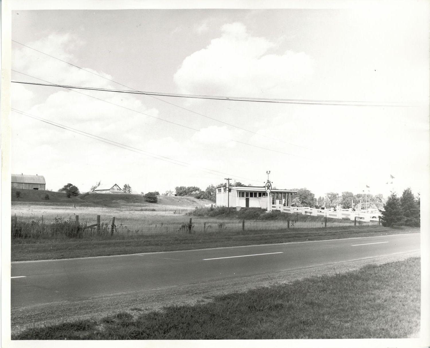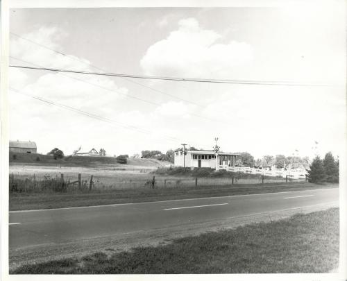DescriptionPhotograph of a two lane road (Q.E. Highway) looking towards a commercial "Texaco" gas station in a rural setting; on the proper right is a field with a large wooden barn in the distance; second barn right next to the first barn; on the proper left is the Texaco gas station; white commercial building with a white wooden fence surrounding the property and parking lot; few cars are parked in the Texaco parking lot; three evergreen trees are on the side of the roadway; running from proper right to proper left is Q.E. Highway; in the bottom proper left corner is a section of grass at the side of the road