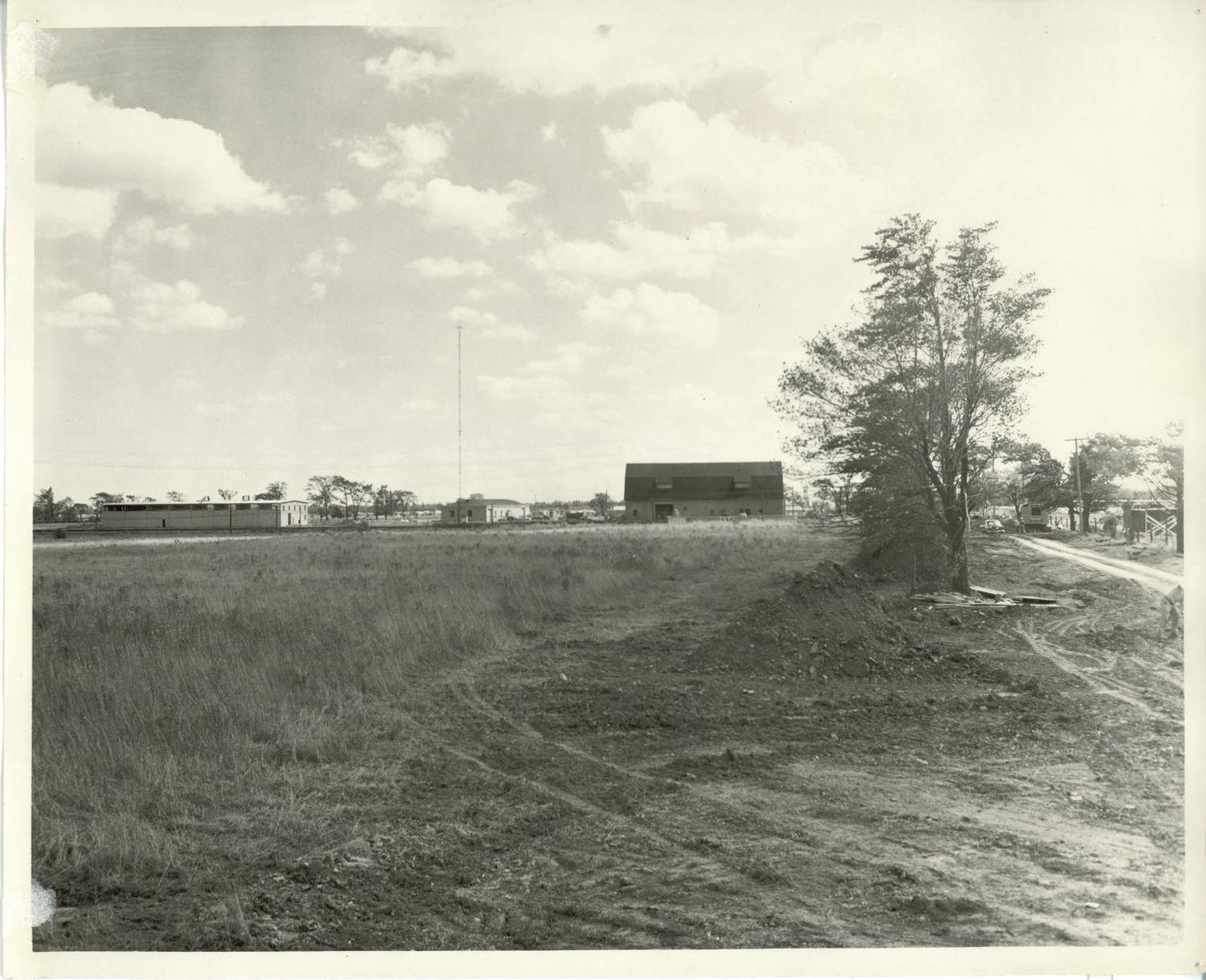 DescriptionPhotograph of a rural setting of a field with a group of industrial buildings in the distance; antenna can be seen in the middle of the group of buildings; part of the field appears to be dug up and the grass is removed on the proper left; on the proper left a dirt road can be seen with a couple of vehicles in the distance; various trees can be seen running along each side of the road