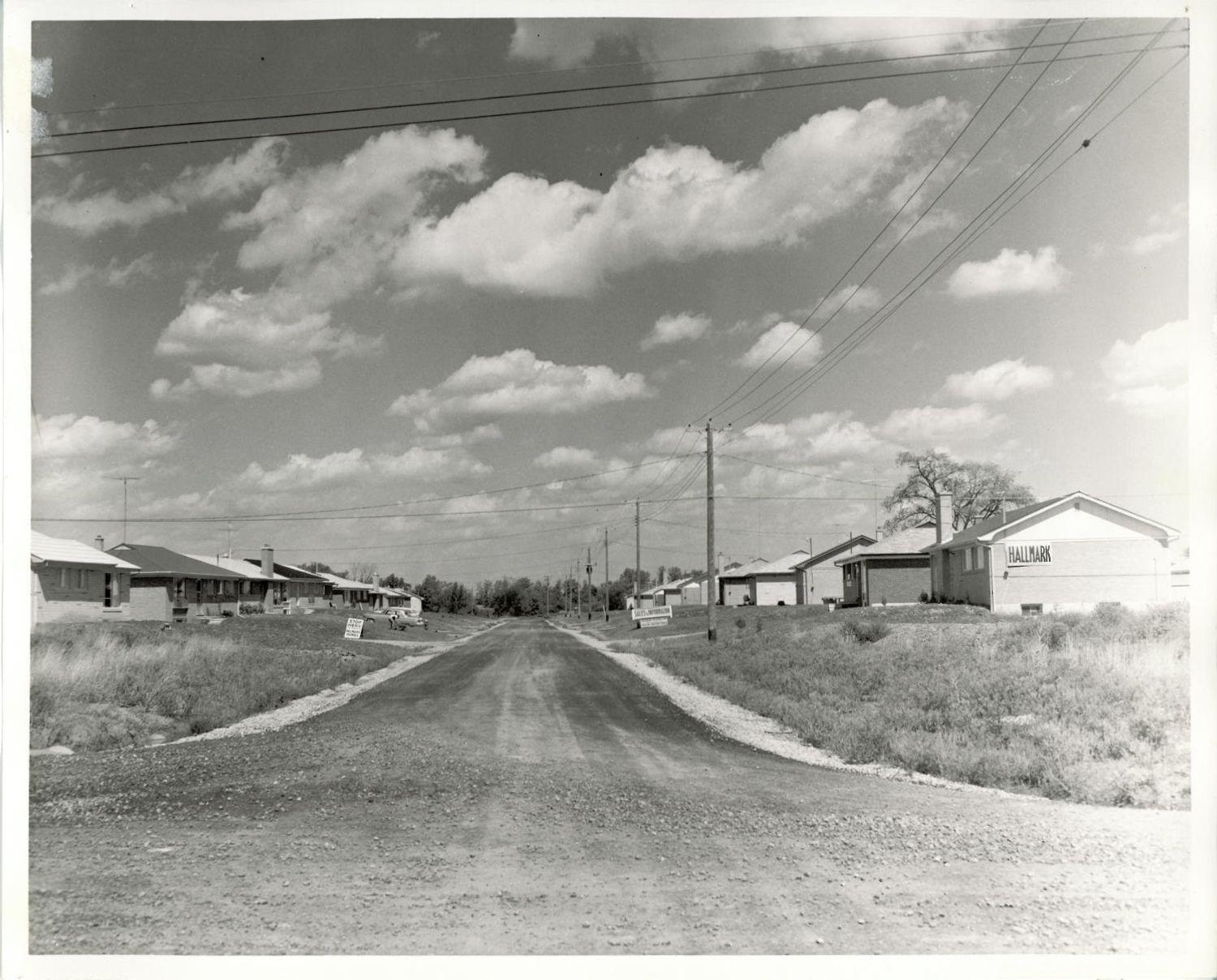 DescriptionPhotograph of a new subdivision development taken from the middle of an intersection on Bridge Road from Sherin Drive; sign for a showroom home can be seen on the proper right; parked car on the proper right in one of the drive ways; on the proper left is a big white sign on one of the homes that reads "Hallmark"; there is another sign further up on the proper left for that sales and information office; hydro/telephone lines are on the proper left of the street running along Bridge Road