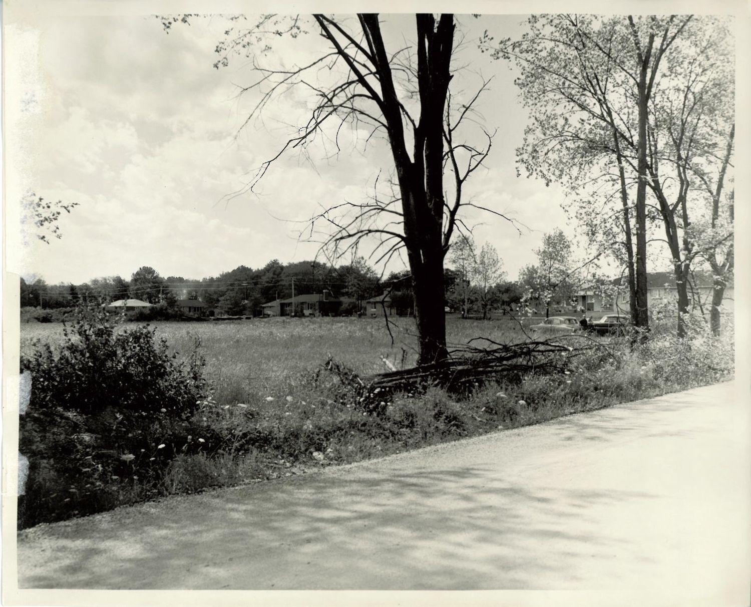 DescriptionPhotograph of a vacant plot of land in a residential neighbourhood; Third Line can be seen at the bottom of the photograph; just above the roadway in the center and far proper left are trees that are at the side of the roadway; on the proper right is a shrub and what appears to look like a mound of dirt that is also on the side of the roadway; vacant field can be seen in the far center; two vehicles can be seen parked in the field on the proper left; two men can also be seen sitting on one of the parked vehicles; in the far distance are trees and other various residential buildings