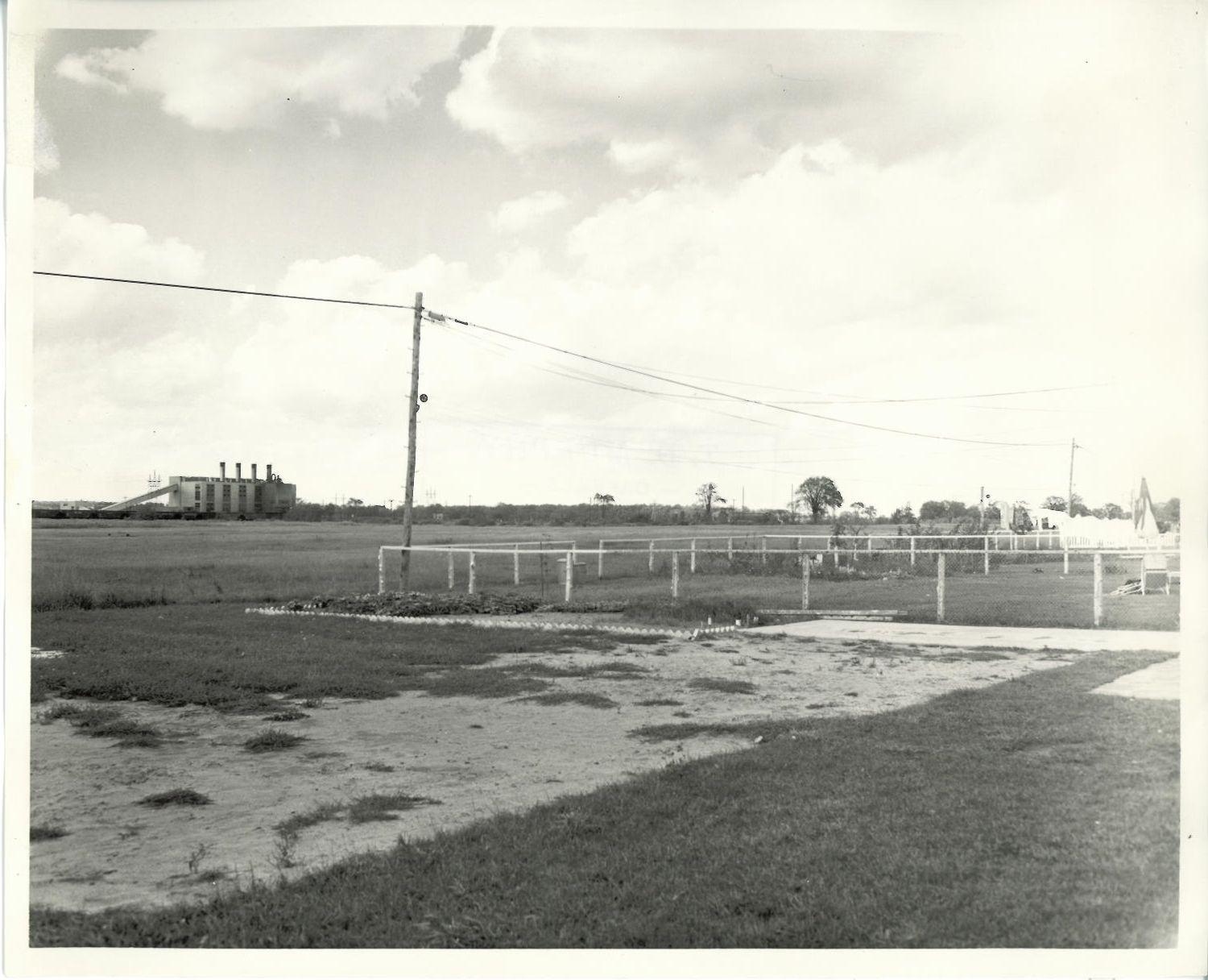 DescriptionPhotograph of the backyard of a residential property looking towards the "Boiler House" for Ford Motor Company; from the center to the proper left is a wooden frame and wire fencing bordering the residential property; tall hydro/telephone pole can be seen in the corner of the fenced property; clothes line is running from the pole and laundry can be seen further along on the line; large industrial building can be seen in the far proper right which is the "Boiler House" for the Ford Motor Company; various trees can be seen in the distant on the horizon