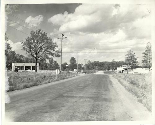 DescriptionPhotograph of Constance Drive facing east towards Maple Grove Drive; on the proper right is a "B/A" gas station that appears to be under construction which is on the northeast corner of Maple Grove Drive and Constance Drive; dark coloured vehicle can be seen in front of the garage facing towards the gas station; on the proper left are a group of residential homes on the southeast corner of Maple Grove Drive and Constance Drive; car and a person can be seen in the far distance on Constance Drive; in the far distance are various trees