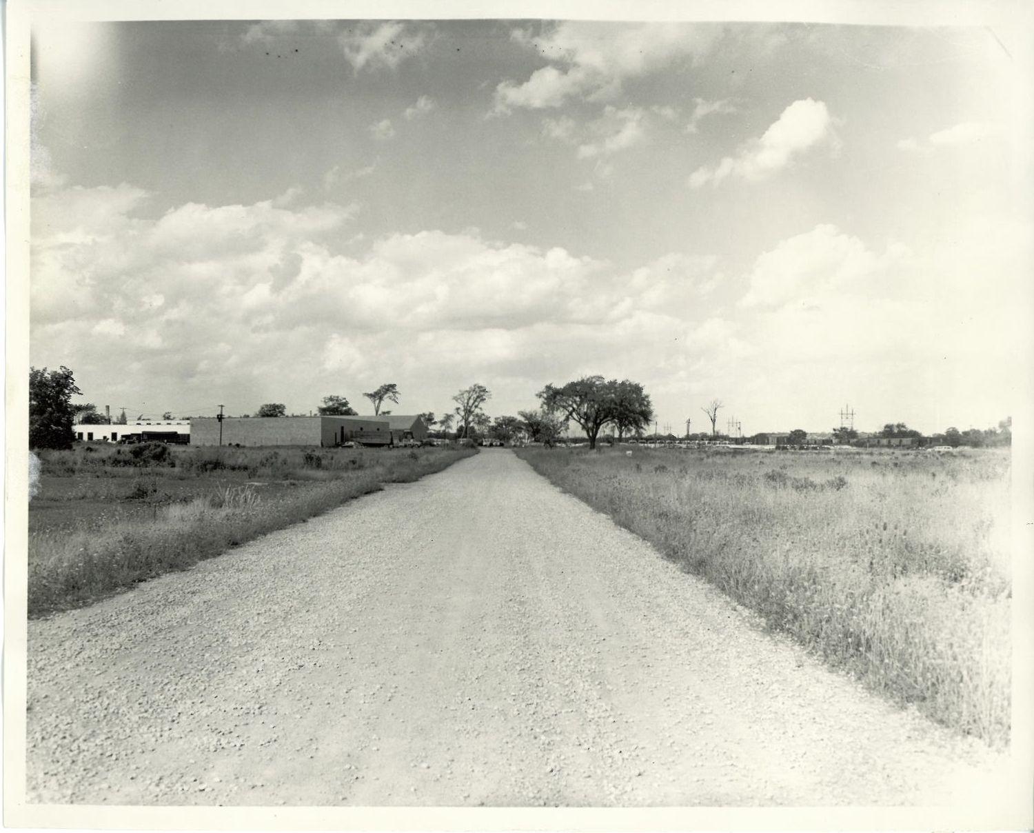 DescriptionPhotograph of rural scene of a dirt/gravel road (Industry Street) in the center looking east; on the proper left are overgrown grass fields with trees and an industrial single leveled building in the background; on the proper left, right of the road, are overgrown grass fields with vehicles and train cars in the far background