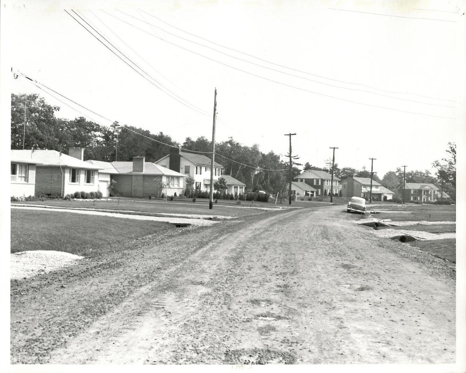 DescriptionPhotograph of two lane curved dirt/gravel road in a residential neighborhood facing south; on the proper right are residential properties facing Riverside Drive with single car driveways; first two properties are brick single storied bungalows; third house on the east side of the road is a white siding two story house with an attached double garage; there are is a space/vacant plot of land between the white siding house and a red brick two story house with a detached white garage; on the proper left is a continuation of two more residential houses on the east side of Riverside Drive; both are two story brick homes with double garages attached; car can be seen on the proper left parked on the Eastside of Riverside Drive facing away from the photographer