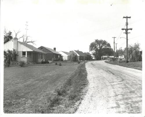 DescriptionPhotograph of two lane gravel road (Lakewood Drive) heading north; on the proper right are two residential homes with brick and siding construction facing the road way with single car driveways and grass front lawns at each property; in the center is a bend in the road with additional houses facing the roadway; large tree can be seen at the bend in the road; on the proper left, four hydro/telephone lines can be seen on the eastside of the road; few trees and shrubs can be seen on the grass front lawns of residential properties