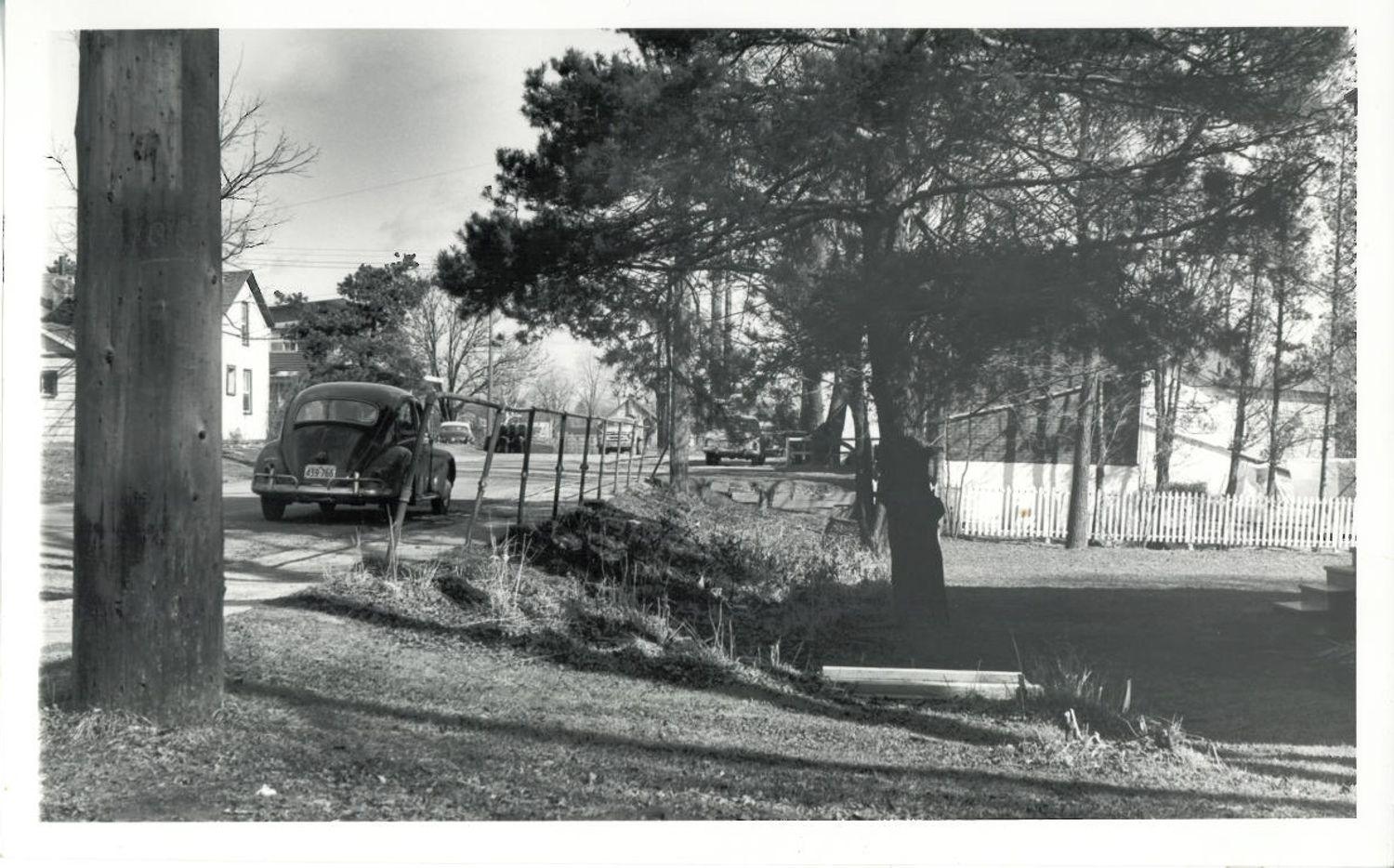 DescriptionPhotograph taken on private property of Rebecca Street facing west; on the proper right a hydro/telephone pole can been seen with a two story residential property behind it on the Southside of Rebecca Street; there is also a parked car on the Northside of Rebecca Street facing west; metal fence is on the Northside of Rebecca Street between the sidewalk and edge of the property; there are several trees on the grass lot of the property; white picket fence is located at the rear of the property; in the background are other residential buildings and trees
