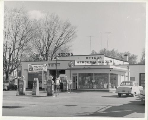 DescriptionPhotograph of Oakville Motors Service Station on the Southwest corner of Lakeshore Road and Reynolds Street; large service station with two rows of two gas pumps are near the proper right are at the front of the business; commercial stand with cans of motor oil can be seen between where the first row of gas pumps are; in the center is the commercial building with white exterior walls; on the proper right of the building itself are two garage doors to the business; on the proper left of the building is the store front window to the business; display of motor oil cans on the interior windows of the building can be seen facing Lakeshore Road; on the proper left of the photograph a vehicle is parked on the lot facing away from Lakeshore Road