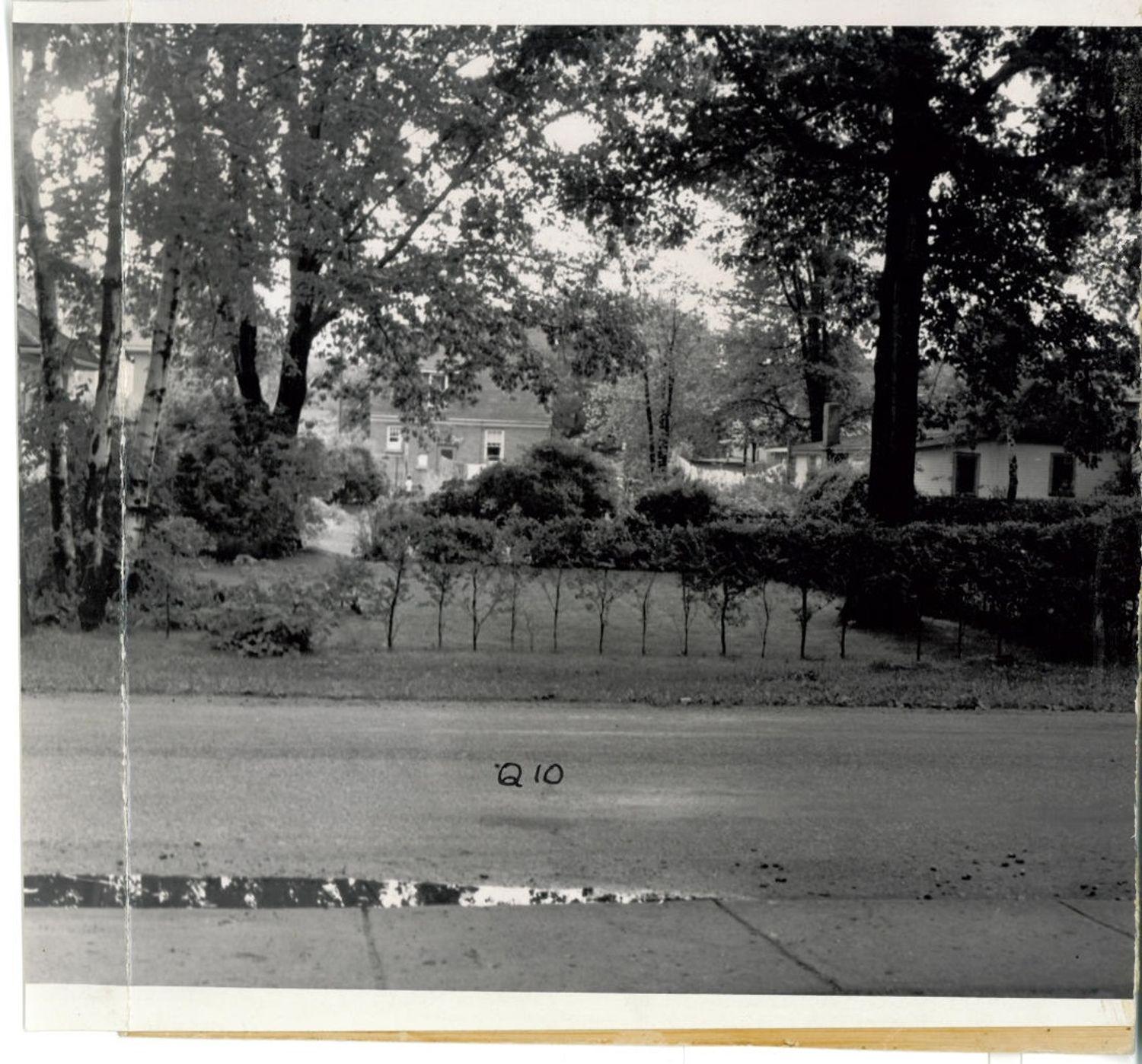 DescriptionPhotograph of a vacant lot now known as 370 Maple Avenue; property has two trees on the proper right the first is a birch tree and the second tree is set further back; in the background is the back of the neighbouring residential properties; on the proper left is a large tall tree; hedge can be seen at the front of the property next to the paved roadway (Maple Ave); "Q 10" is written in ink on the front of the photograph