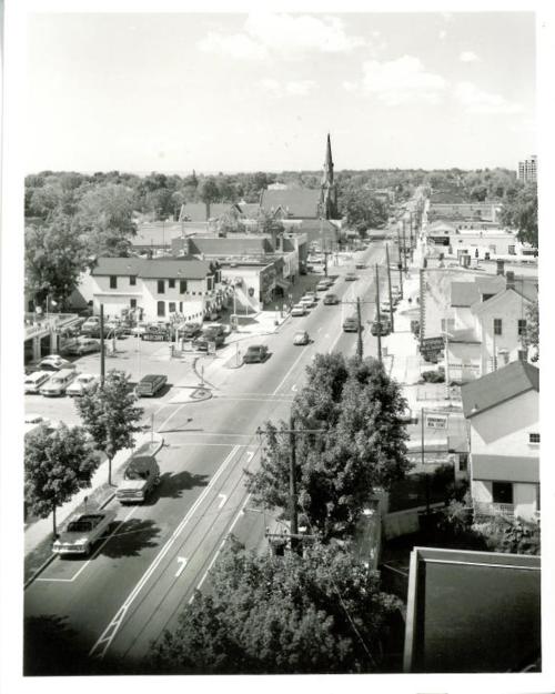DescriptionPhotograph of a street view of Downtown Oakville taken from a rooftop on Lakeshore Road East facing toward Reynolds Street and Trafalgar Road; on both side of Lakeshore Road East are various commercial businesses; various vehicles are on either side of the street; garage can be seen on the southwest corner of Lakeshore Road East and Reynolds Street; church steeple for Knox Presbyterian Church can be seen on the southeast corner of Lakeshore Road East and Dunn Street