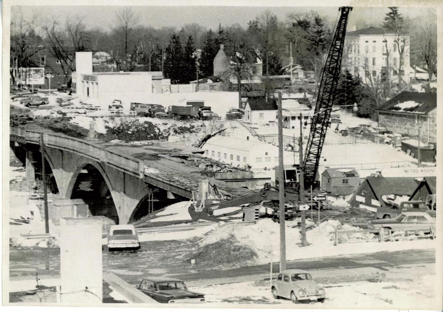 DescriptionPhotograph of the reconstruction of Lakeshore Road Bridge going across Sixteen Mile Creek; large crane can be seen on the west side of the bridge along with various vehicles parked at the bottom of the photograph; commercial garage can be seen near the proper right corner of the photograph on the corner of Lakeshore Road and Navy Street; part of the Granary building on Robinson Street can be seen on the proper left top corner along with the old "Canadian Hotel" on the southeast corner of Navy Street and Robinson Street