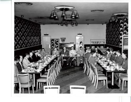 DescriptionBlack and white photograph of a group pf gentlemen sitting at a large "U" shaped table in what appears to be a restaurant in Dorval Quebec. Facing the cameraman at the center of the table wearing a light coloured blazer and tie is Robert John Pratt Mayor of Dorval. To his right is William Anderson Mayor of Oakville.
