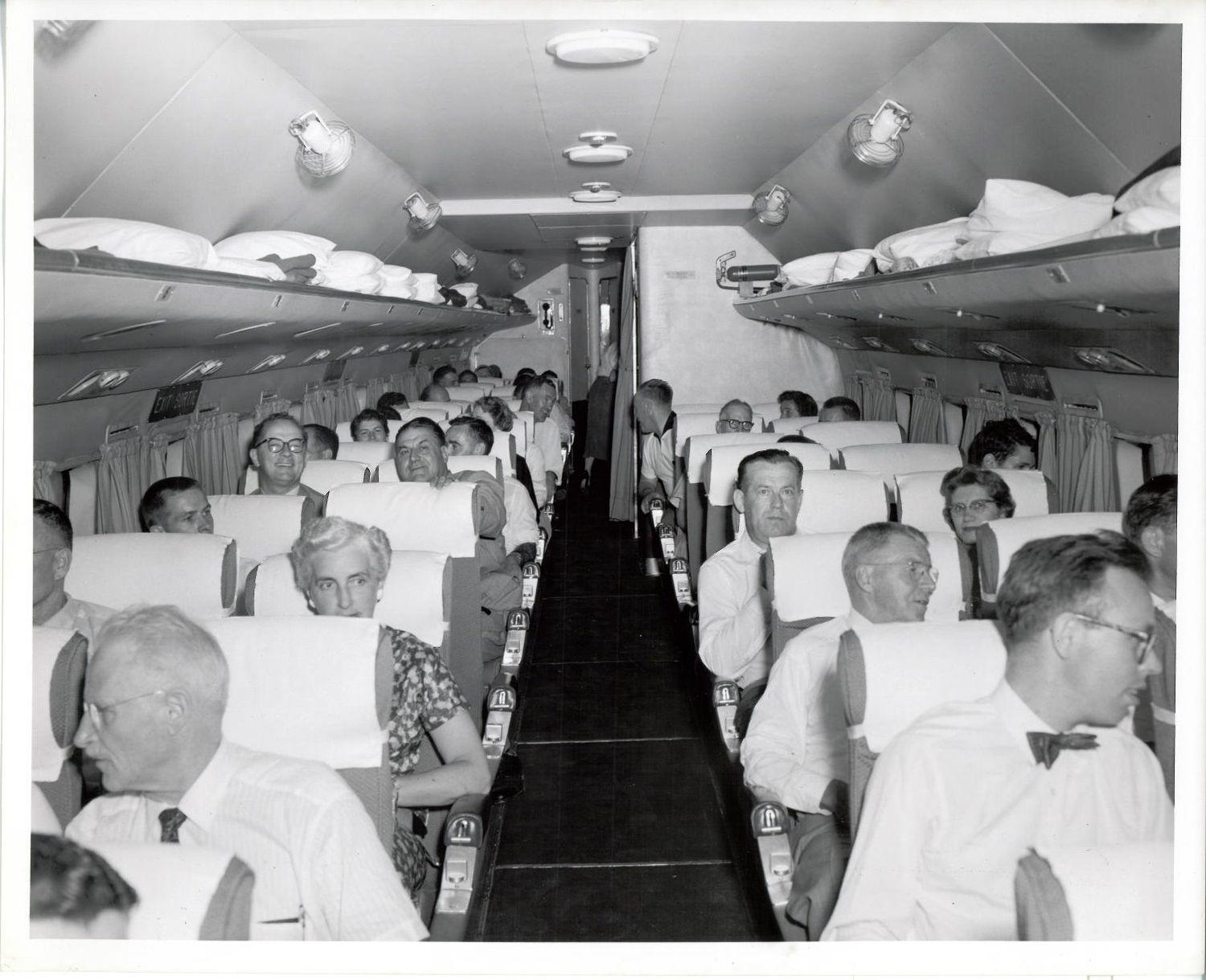 DescriptionBlack and white photograph of a group of people sitting on a commercial airline; The interior of the plane has a row of two seats on either side of the plane along with an overhead shelf on either side with pillows and blankets on both sides
