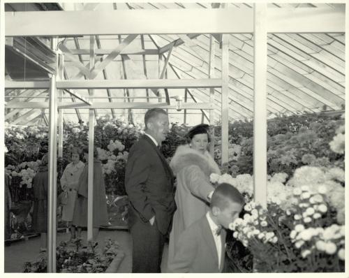 DescriptionBlack and white photograph of a flower show taken inside a greenhouse; a young boy can be seen smelling some of the flowers that are surrounding the room; Judge Jim Black can be seen standing in the center talking to Emily Farr; in the far proper right three woman can be seen talking