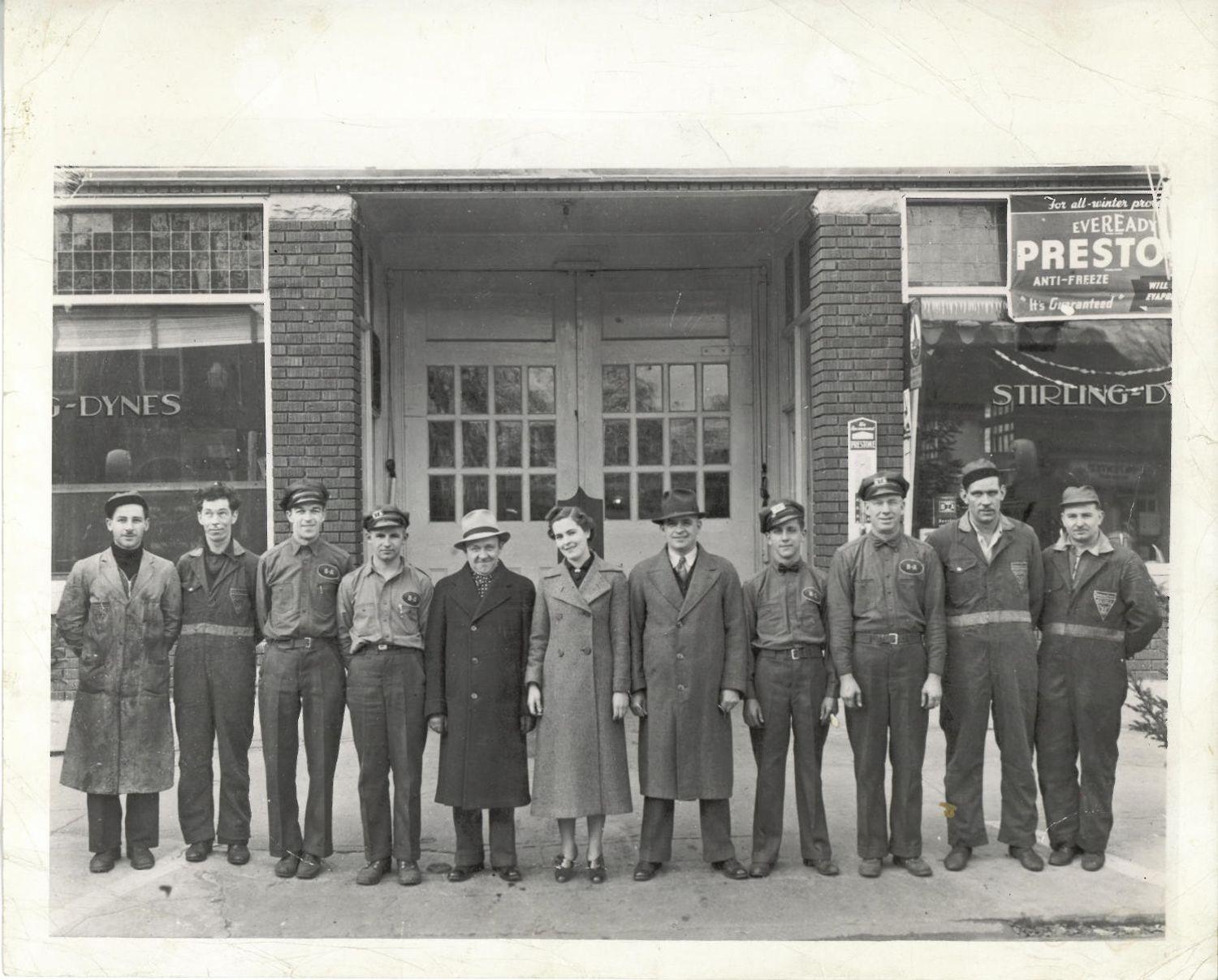 DescriptionBlack and white photograph of the staff of Stiring - Dynes standing outside the automotive shop that was located on the southwest corner of Lakeshore Road and Navy Street; the building has a brick exterior with large windows on either side of the front light colured double doors of the building. From proper right to proper left the people are identified as Bill Anderson, Almer Giddings, Jimmy Steed, Laurie Dynes, Harold Stirling, Mrs. Caroline Rose, Vernon Dynes, Bill Dando, Albert Hughes, John Robinson, and Ron Clarke