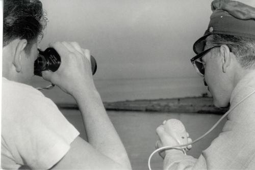 DescriptionBlack and white photograph of two men facing away from the cameraman looking towards Lake Ontario at the mouth of Sixteen Mile Creek; On the proper left is Harold Bateman, Commander of the TOWARF holding a radio in his left hand; On the proper left is a younger man looking through binoculars towards Lake Ontario;