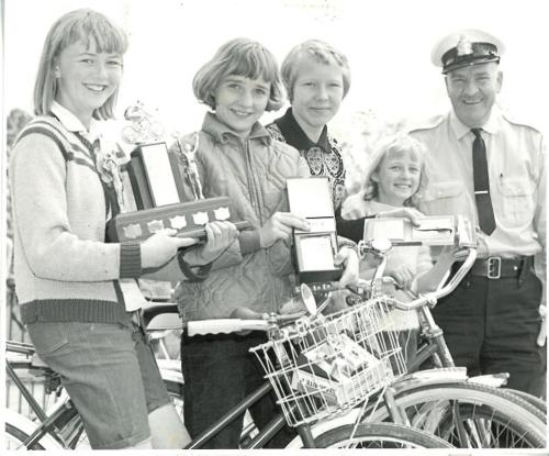 DescriptionBlack and white photograph of Saftey Officer Constable Alf Hooks on the proper left standing with four children and their bicycles holding various awards