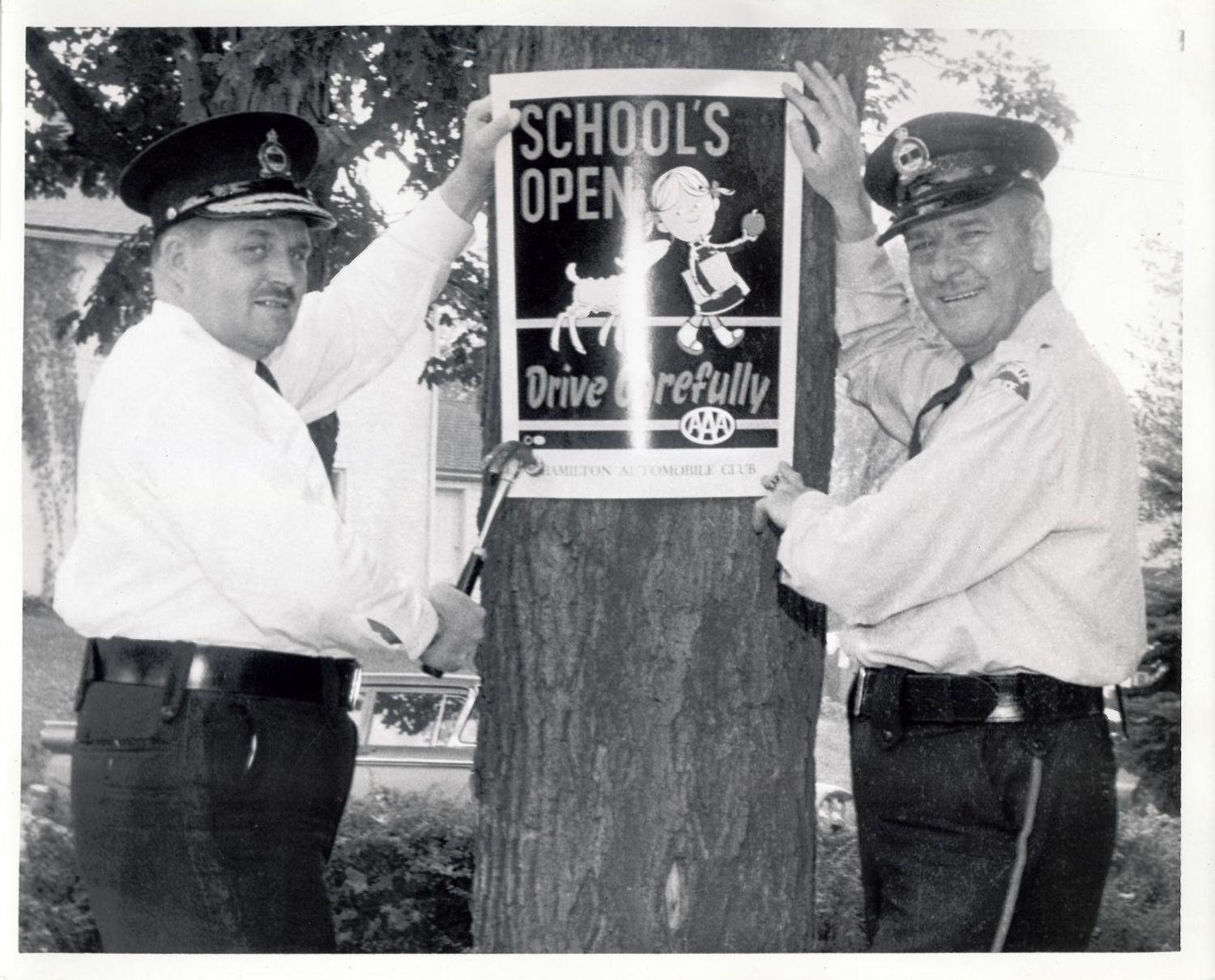 DescriptionBlack and white photograph of Chief of Police Fred Oliver on the proper right; Safety Officer Constable Alf Hooks can be seen on the proper left; Both Officers are holding a sign on a tree that reads "SCHOOL'S OPEN Drive Carefully AAA Hamilton Automobile Club"; Police Chief Fred Oliver is holding a hammer to the sigh