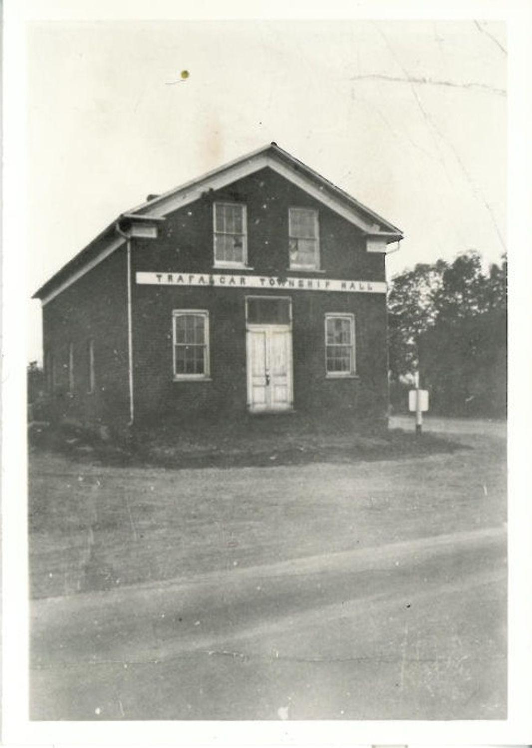 DescriptionBlack and white photograph of the Trafalgar Township Hall; Building has a brick exterior; Building was located on the southeast corner of Dundas Street and Trafalgar Road