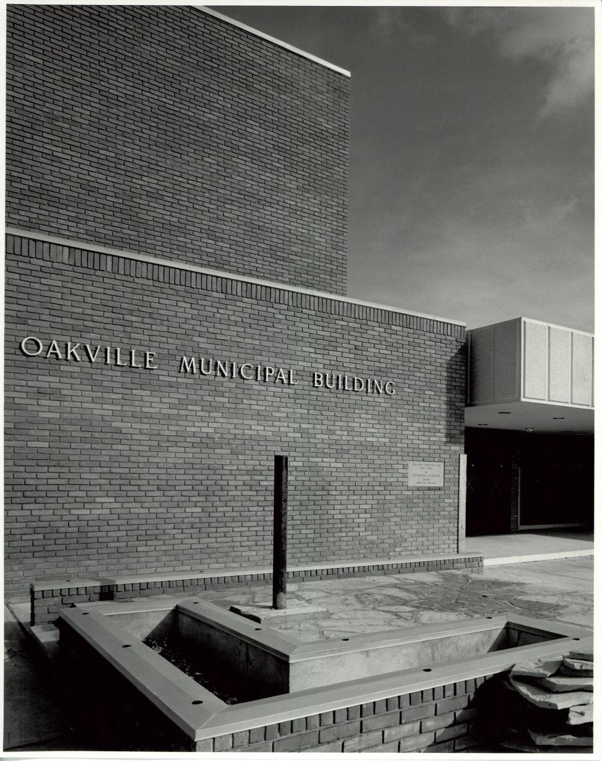 DescriptionBlack and white photograph of the exterior entrance to the "Oakville Municipal Building"; the exterior wall is red sand-faced brick exterior; the main entrance can be seen on the proper left of the photograph