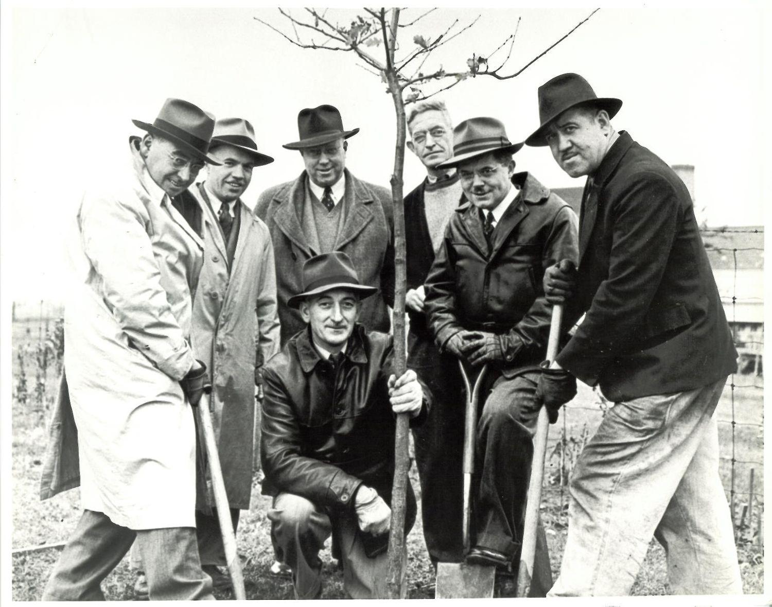 DescriptionBlack and white photograph of a tree planting ceremony; 6 men can be seen standing around a tree; From left to right are Mayor William Anderson, Howard Litchfield, "Doc" Dean, Phil Chambers, Dr. Morris Lernance, A.E. "Ham" Whitaker; John Dunn is kneeing in the center holding the tree;