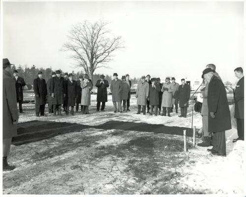 DescriptionBlack and white photograph of the ground breaking at Oakville Municipal Building at Trafalgar Rd. and White Oaks Blvd.; A man appears to be making a speech on the proper left in front of a group of people outside; there is a light covering of snow can be seen on the grass/ dirt ground; A few people identified in the photo are (5th person, left) Kelly New, (7th person, left) Fred Tilley, (10th person, left) Jack Orr; A large tree can be seen behind the spectators and a tree line can be seen in the far distance