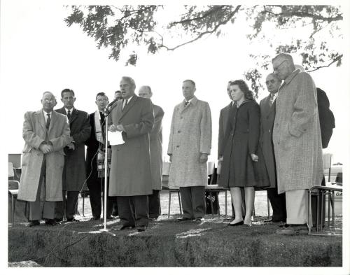 DescriptionBlack and white photograph of a group of people standing on a podium at Trafalgar Square; Mayor William Anderson can be seen standing on the far left; A man can be seen standing at the microphone making a speak;