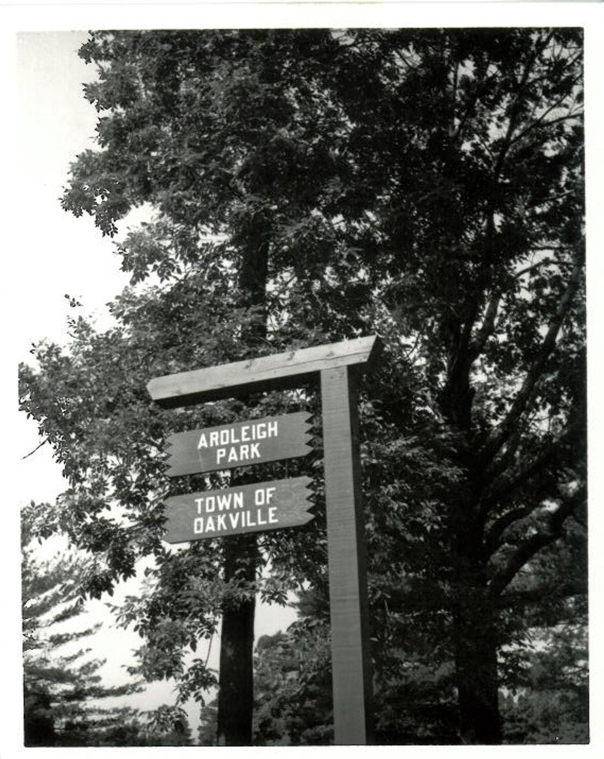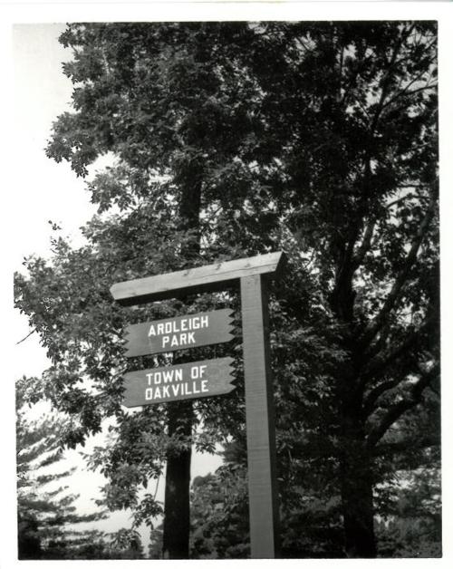 DescriptionBlack and white photograph of the Town sign for Ardleigh Park; Wooden signs connected by chains on a wooden post; Bottom part of park sign reads "TOWN OF OAKVILLE" top part reads "ARDLEIGH PARK"; Trees can be seen in the background