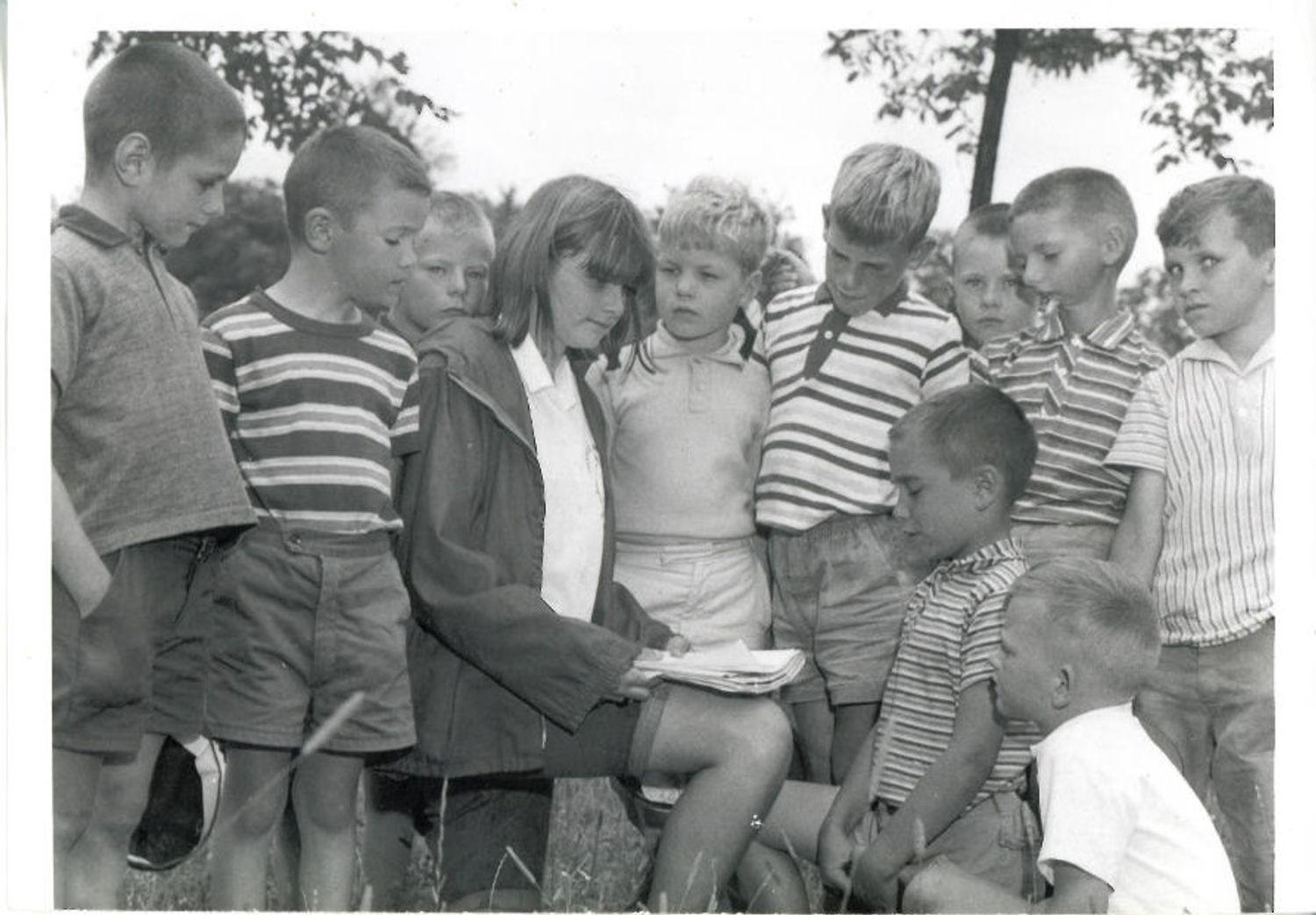 DescriptionBlack and white photograph of children partaking in a Day Camp in the 1960's; Group of boys are gathered around a Camp Counselor who is kneeling and holding papers; It appears that they are in a field or park with long grass; trees and shrubs can be seen in the background