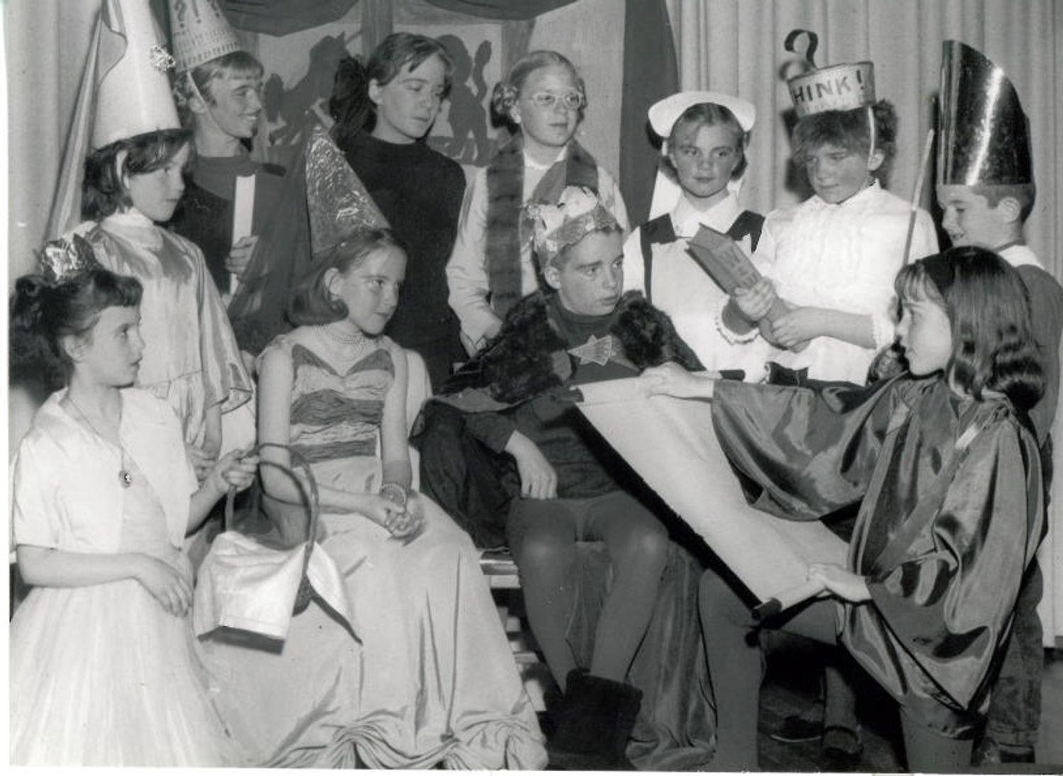 DescriptionBlack and white photograph of children participating is a Town Day Camp in the 1960's; Children are all dressed in costumes posing for the photo; The two children sitting in chairs are dressed as a king and queen; A child kneeling on one knee and is dressed as a court Paige; The rest of the children are all facing or looking at the child in the Paige costume