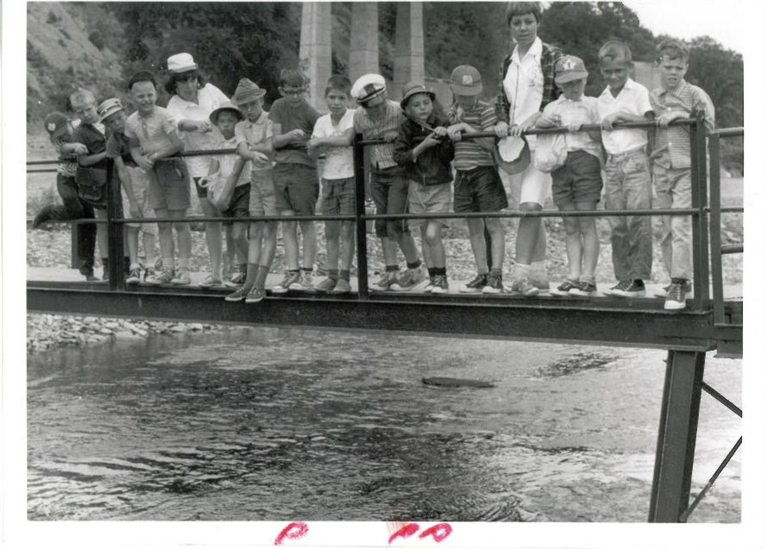 DescriptionBlack and white photograph of children participating in the Town Day Camp in the 1960's; Children are at Lyons Valley Park and are on a pedestrian bridge over Sixteen Mile Creek; There are 14 children and 2 cam counselors; The abutments for the Dundas Street Bridge can be seen in the background