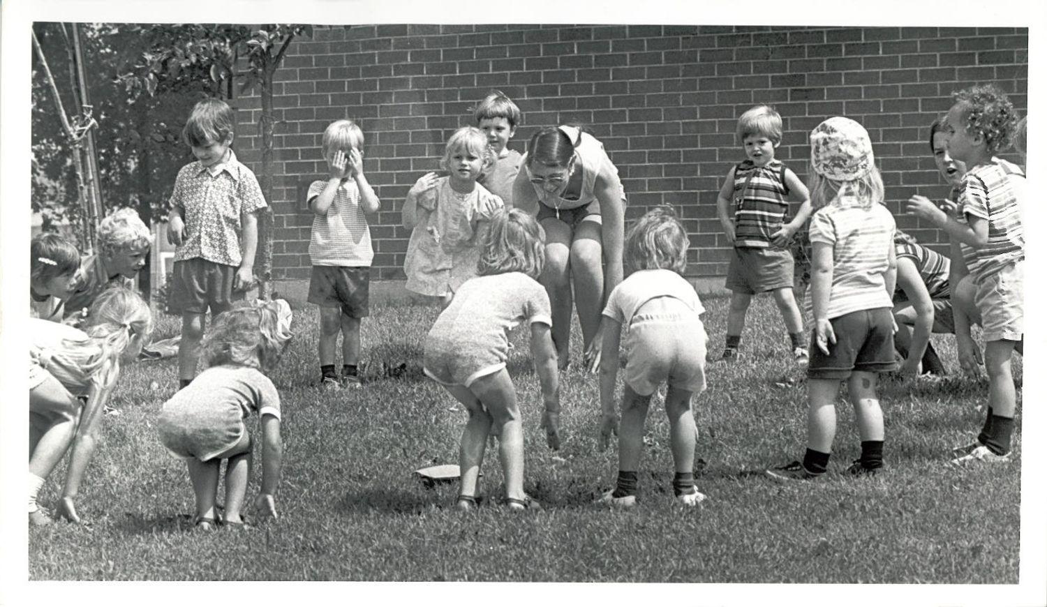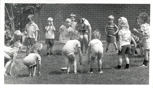 DescriptionBlack and white photograph of small children playing a game with their camp councilors outside of a building with a brick wall