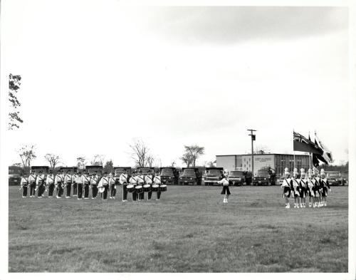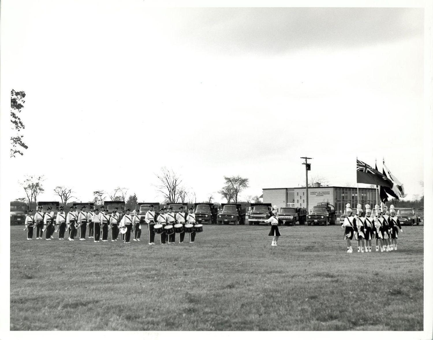 DescriptionBlack and white photograph of the Trafalgar Drum and Bugle Corp. preforming in a field outside the Trafalgar Township School Office Administration building; The band can be seen on the proper right while the colour guard can be seen on the proper left; There is a row of trucks behind the band on the field; The Trafalgar Township School Administration Building is in the far background