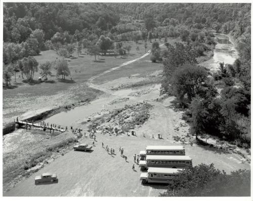 DescriptionBlack a white photograph of the Day Camp at Lions Valley Park; Photograph taken from the Highway No. 5 (Dundas Road) Bridge overlooking the park; Three school buses are parked in the park parking lot; A group of children and camp counselors can be seen walking over a pedestrian bridge over Sixteen Mile Creek towards the buses; In the valley are numerous trees, grassy land and a dirt trail heading further north in the valley