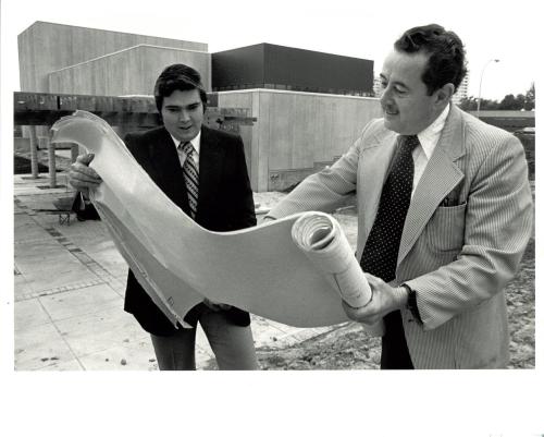 DescriptionBlack and white photograph of Mayor Harry Barrett looking over the plans for the Oakville Center; a unknown man is also holding the plans that Mayor Barrett is looking at; in the background is the Oakville Center that appears to be still under construction