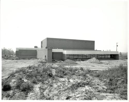 DescriptionBlack and white photograph taken outside of the Municipal Building in 1965; it appears that the photograph is of the west side of the building; mounts of dirt can be seen in front of the building; the building is still under construction in the photograph