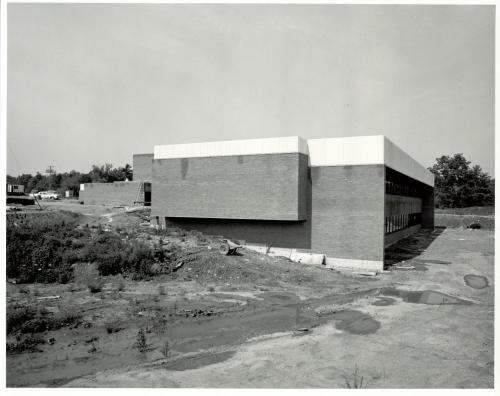 DescriptionBlack and white photograph of the Municipal Building construction in 1965; the photograph shows the front of the building looking westward; the exterior is a red brick exterior and is still under construction as equipment can be seen in the photograph; the construction office is on the far proper right along with some parked vehicles